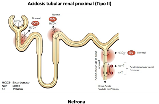 En la acidosis tubular renal proximal (ATR tipo II), los túbulos proximales no reabsorben apropiadamente el bicarbonato, dejando el cuerpo en estado ácido (llamado acidosis). La severidad de la acidosis se relaciona con la cantidad de bicarbonato que se logra reabsorber.