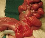 Debido a que los intestinos no están recubiertos por un saco protector y quedan expuestos al líquido amniótico durante el embarazo; esto hace que se irriten, lo cual causa que se acorten o se hinchen.