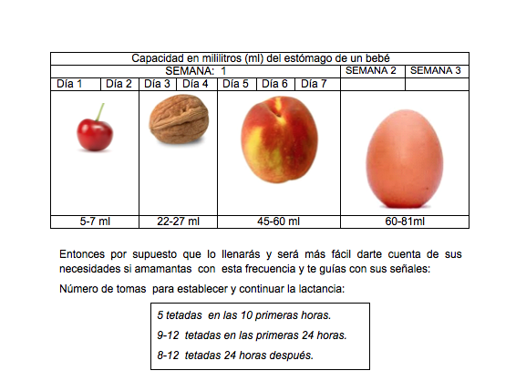 Regresando al tamaño del estómago de tu bebé y por supuesto que lo llenarás si no crees que los bebés se crían como en la tele: con horarios, con controles de tetadas y tiempo y sobretodo que duermen solos toda la noche. El tamaño del estómago es así: