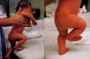 Si el médico levanta al bebé alzándolo de un costado, éste encogerá la pierna de arriba mientras que estira la otra dejándola “colgar”. Se comprueba así su sentido de equilibrio.