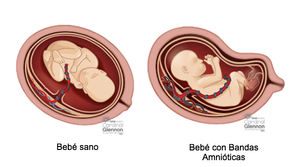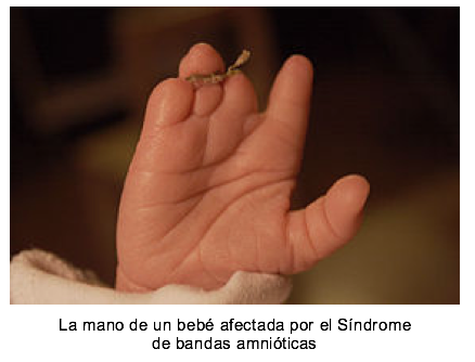 El Síndrome de bandas amnióticas es un grupo de defectos al nacimiento que ocurre cuando algunas partes del feto en desarrollo (generalmente son brazos, piernas o dedos) se “enredan” en bandas amnióticas de tipo fibroso dentro del útero las cuales restringen el flujo de sangre y afectan el desarrollo del bebé.
