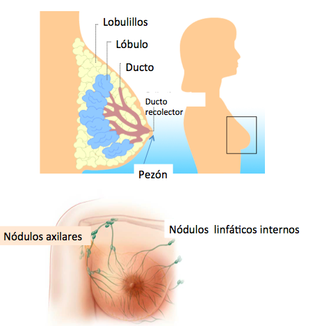 Cada mama contiene también vasos sanguíneos y vasos linfáticos. Los vasos linfáticos transportan un líquido prácticamente incoloro llamado linfa. Los vasos linfáticos conducen a órganos pequeños en forma de frijol llamados ganglios linfáticos que ayudan al cuerpo a defenderse contra infecciones y enfermedades. Los ganglios linfáticos se encuentran en todo el cuerpo. Grupos de ganglios linfáticos se encuentran cerca de la mama en la axila (bajo el brazo), sobre la clavícula (hueso que va del centro del tórax al hombro) y en el tórax, por detrás del esternón.