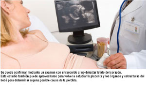 Se puede confirmar mediante un examen con ultrasonido al no detectar latido del corazón. Este estudio también puede aprovecharse para volverse a estudiar la placenta y los órganos y estructuras del bebé para determinar alguna posible causa de la pérdida