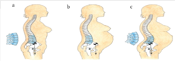 Aumento de peso y cambios en la postura. La mayor parte del peso ganado por la embarazada está concentrado en la parte inferior de la pelvis junto con el aumento de volumen abdominal. Por esto se produciría una tendencia a inclinar el cuerpo hacia delante, lo cual la embarazada tiende a compensar inconscientemente con una posición hacia atrás de la parte superior del cuerpo por sobre la pelvis, restaurando su centro de gravedad, pero aumentando la lordosis (curvatura hacia adelante) del segmento lumbar de la columna vertebral y aumentando el esfuerzo en la espalda.