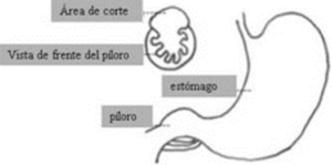 Diagrama de un estómago después de la cirugía reparadora. Observa como se ha hecho un corte en el músculo agrandando el píloro y quitando la obstrucción.